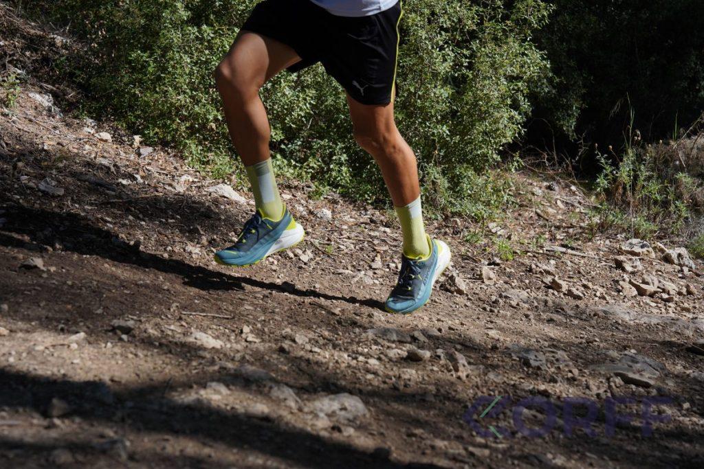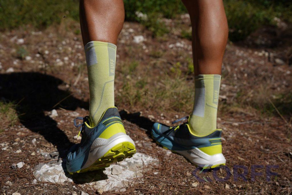 Avant-pied généreux qui laisse respirer les orteils. Col classique : j’aurais préféré un chausson pour l’OCR, mais en trail rien à signaler. Contrefort talon bien enveloppant, aucun glissement. Languette stable, sans point dur.