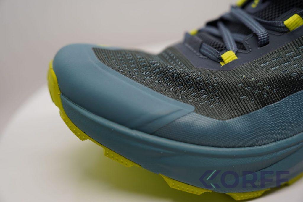 La tige en maille, très respirante, reçoit un pare-pierres et une bande de protection tout autour : c’est précisément ce qui m’a donné envie de l’emmener en OCR.