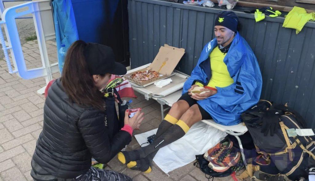 À son arrivée, il est en pleine forme pour ce milieu de course. Tout roule comme prévu : remplissage des flasques, gestion des déchets, vérification du sac, changement de batteries…. Il enfile ses habits de nuit, se restaure [je finirais la pizza 😊] et prend quelques minutes pour souffler après une belle interview.