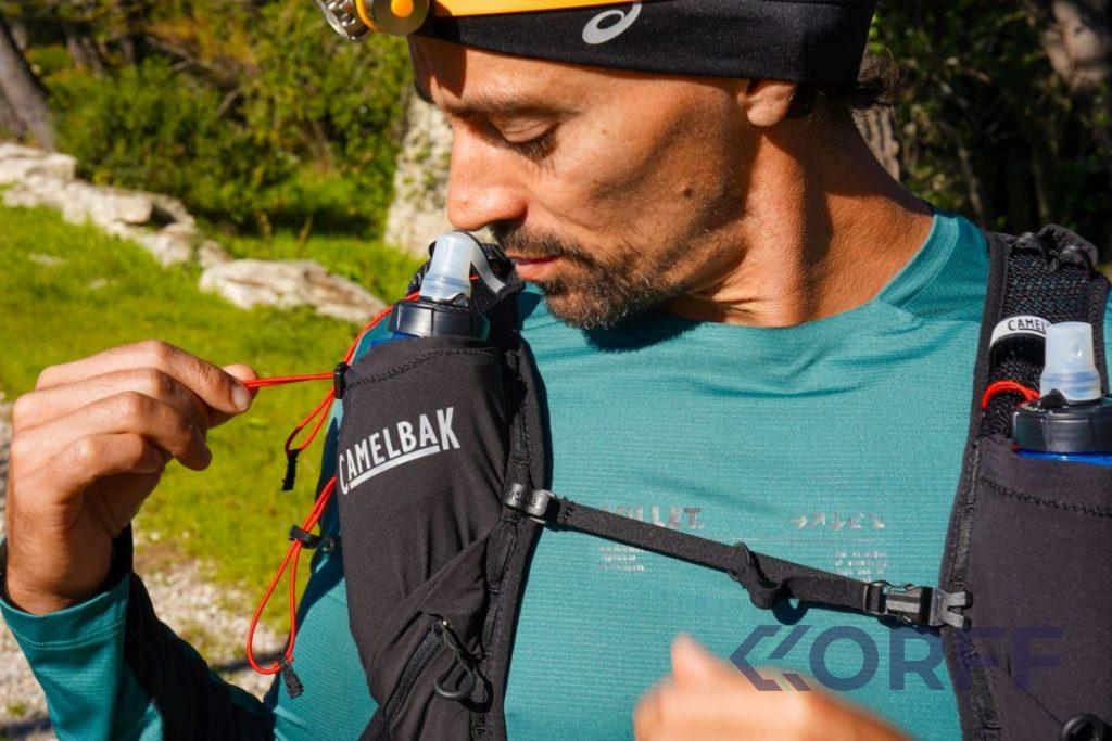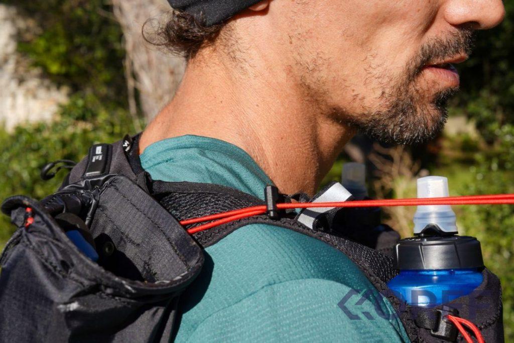 Pour les flasques : la tétine est ovale, donc il faut juste faire un peu gaffe en la mettant dans le gilet. Le débit est vraiment bon, et comme la poche est assez serrée, ça ne glisse pas forcément facilement lorsqu’on l’installe. Par contre, une fois en place, ça ne bouge plus du tout.