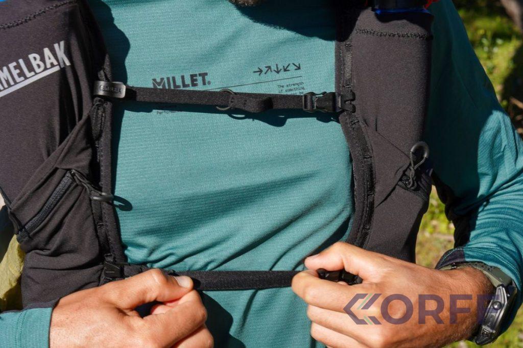 Les deux sangles sternales extensibles offrent un ajustement stable qui limite les rebonds, même quand les flasques sont pleines.