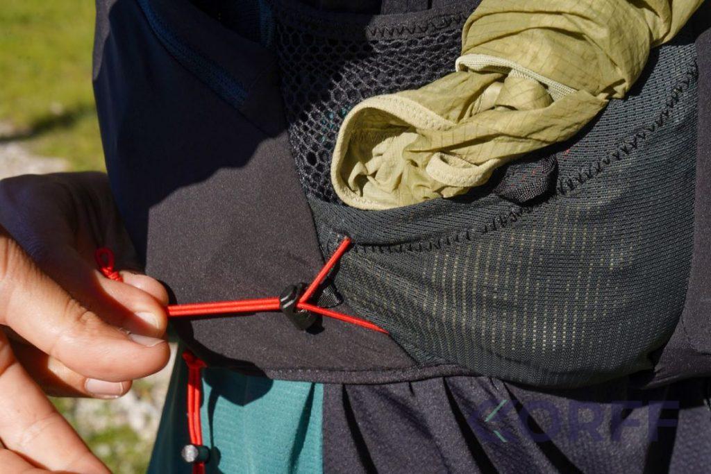 Le gilet propose aussi un carquois amovible (droite ou gauche) pour les adeptes des bâtons, ainsi que des portes‑bâtons élastiques pour les phases de course où l’on veut les ranger rapidement.