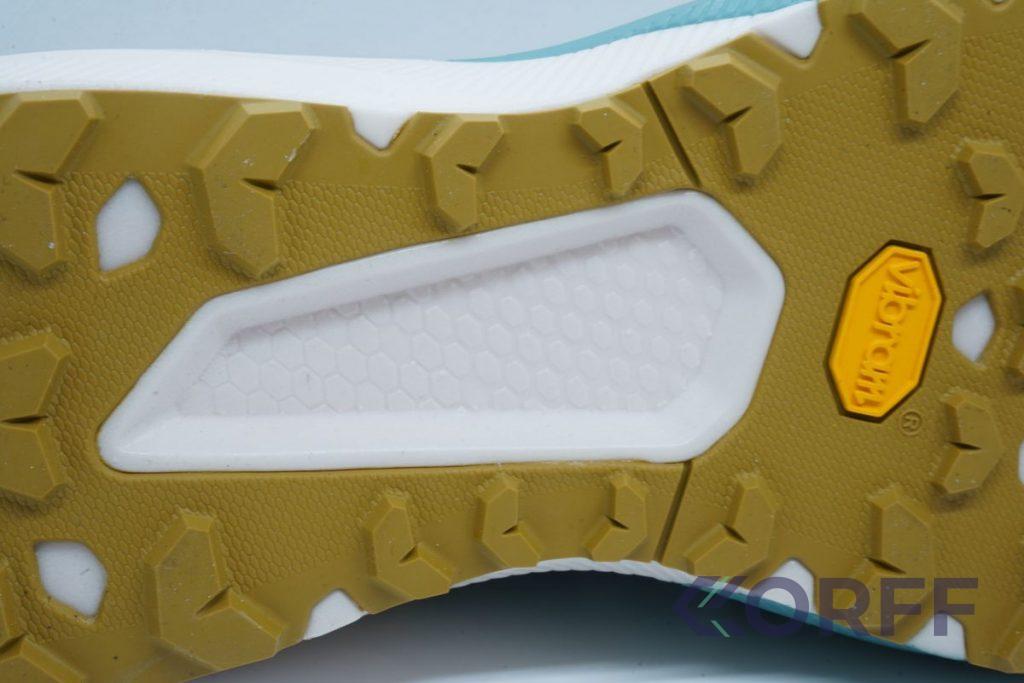 L’empeigne en jacquard maintient le pied sans plis ni frottements, même au-delà de 15 km. Le volume, bien calibré pour un pied standard, laisse assez d’aisance à un médio‑pied légèrement large, sans flottement à l’avant. Le contrefort au talon offre une tenue nette en virage et en descente, sans pression sur le tendon. La semelle de propreté de 5 mm apporte un amorti appréciable sur le bitume, atténue les vibrations et conserve un bon ressenti du sol. Confort simple et efficace, sans besoin de période de rodage.