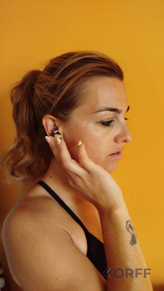 -La forme en “C” a été pensée pour s’adapter à un maximum de morphologies. Elle épouse le pavillon de l’oreille sans points de pression gênants et assure le maintien de façon homogène.