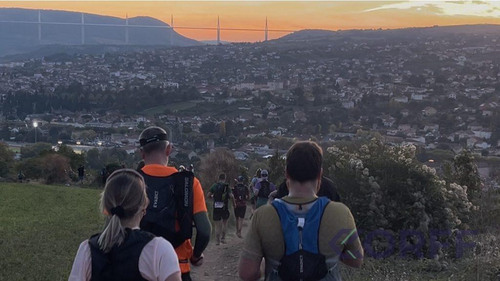 La pente se calme et ça fait du bien. On lève la tête et là, wow: Millau en bas, le viaduc qui la surplombe, et un coucher de soleil qui met tout en orange et pourpre. Le souffle se coupe, pas à cause de l’effort, juste parce que c’est beau. Pour des moments comme ça, on se souvient pourquoi on est là.