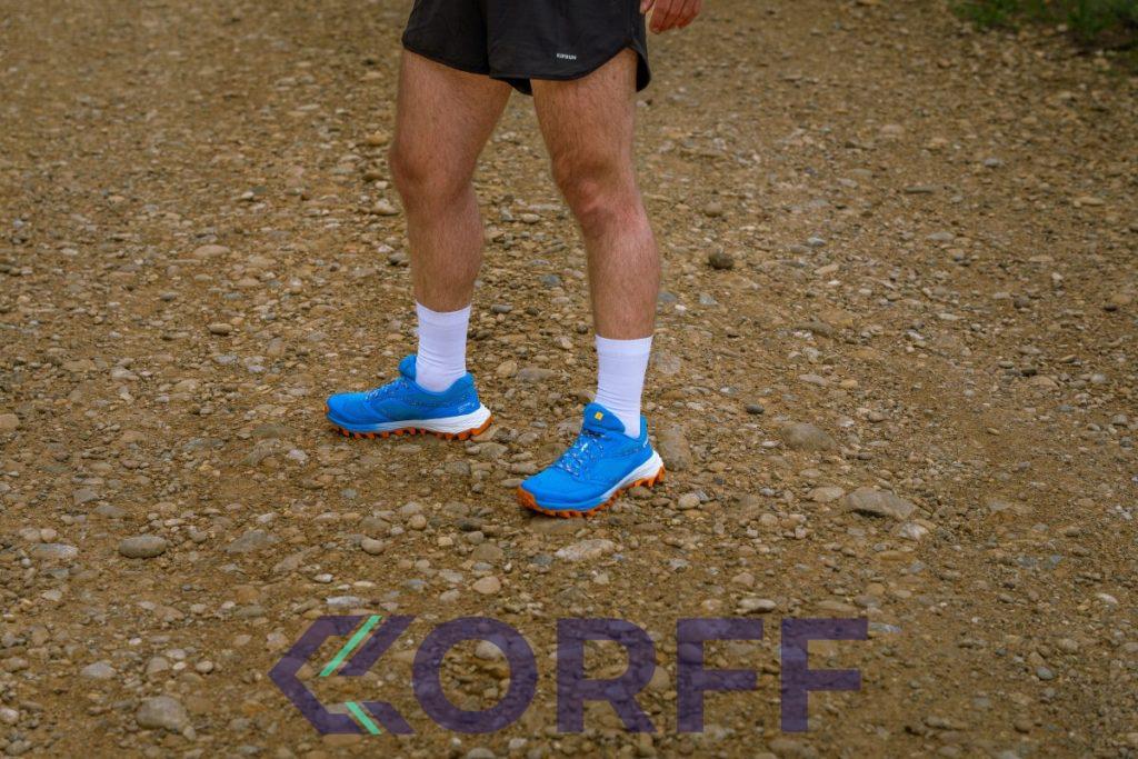 Grâce à ses crampons de 5 mm, elle mord le sol, que ce soit sur terrain sec, humide, rocailleux ou forestier, l’accroche inspire confiance, même dans les descentes engagées. Une sensation qui rassure ! Son drop de 8 mm (rappel, drop = différence de hauteur entre l’arrière et l’avant du pied) offre un bon compromis entre confort et relance. Il permet de ménager les mollets sur les longues distances tout en conservant de bonnes sensations au sol.
