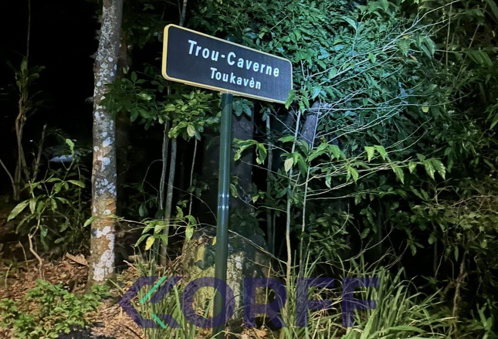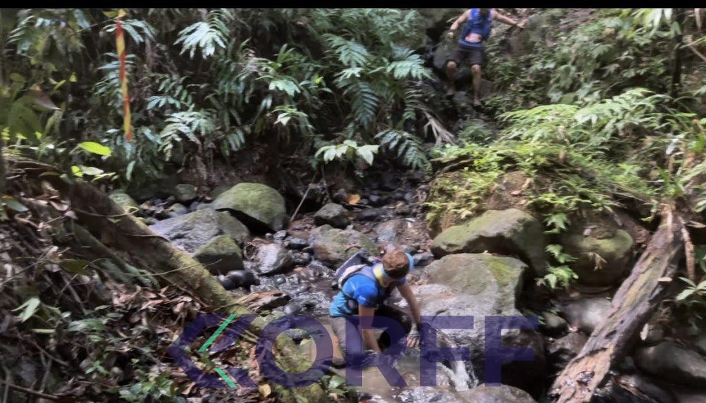 La route goudronnée de cette première section nous plonge rapidement dans le vif du sujet, avec un petit plouf dans l’eau avant de sortir les bâtons pour affronter cette côte très raide qui nous mènera jusqu’à Trou Caverne. Au 5e km, un ravitaillement express est prévu. Déjà 400 mètres de dénivelé, ça pique avant même d’atteindre les premières difficultés spécifique de cette trace Guadeloupéenne. Et ce n’est que le début !